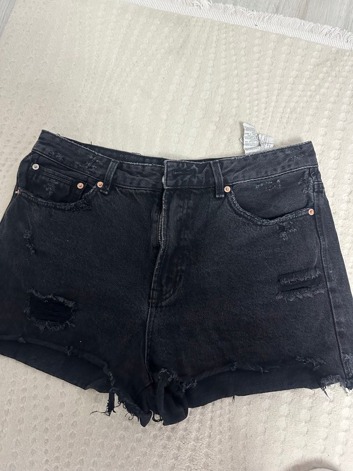 Siyah yırtık detaylı, bol kesim mini denim şort. Günlük kullanıma uygun, rahat ve grunge punk tarzında.