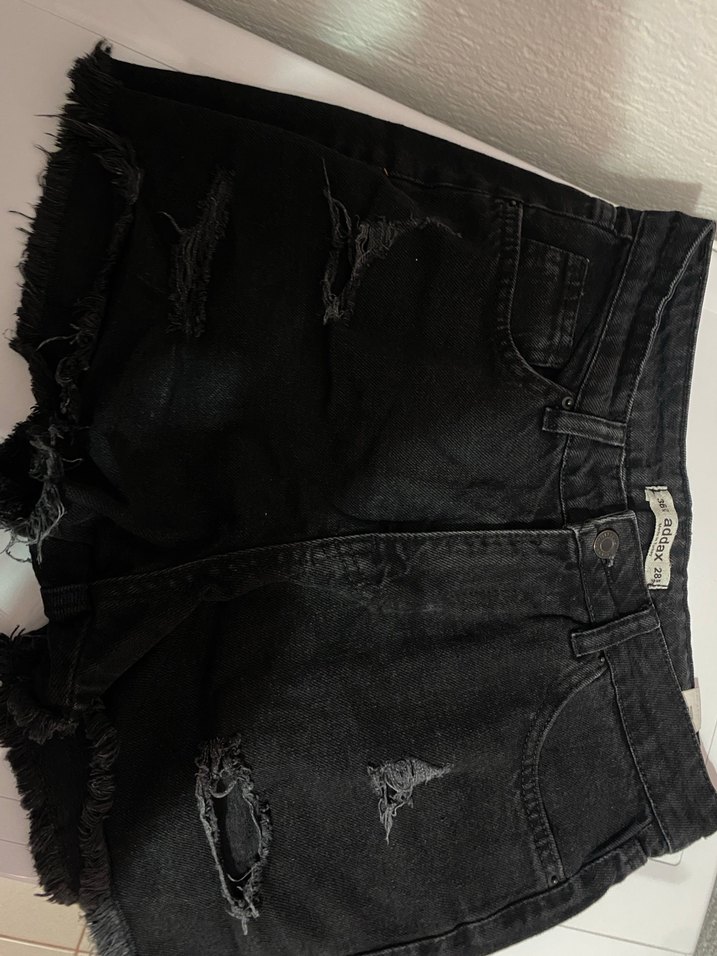 Siyah kot şort, bol kesim ve tokalı detaylara sahip. Yırtık kenarları ve rahat sokak stili ile günlük kullanıma uygun.