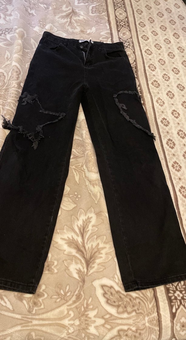 Salaş kesim siyah denim jean, uzun boy ve yırtık detaylı, grunge punk tarzında günlük sokak giyimi için uygun.