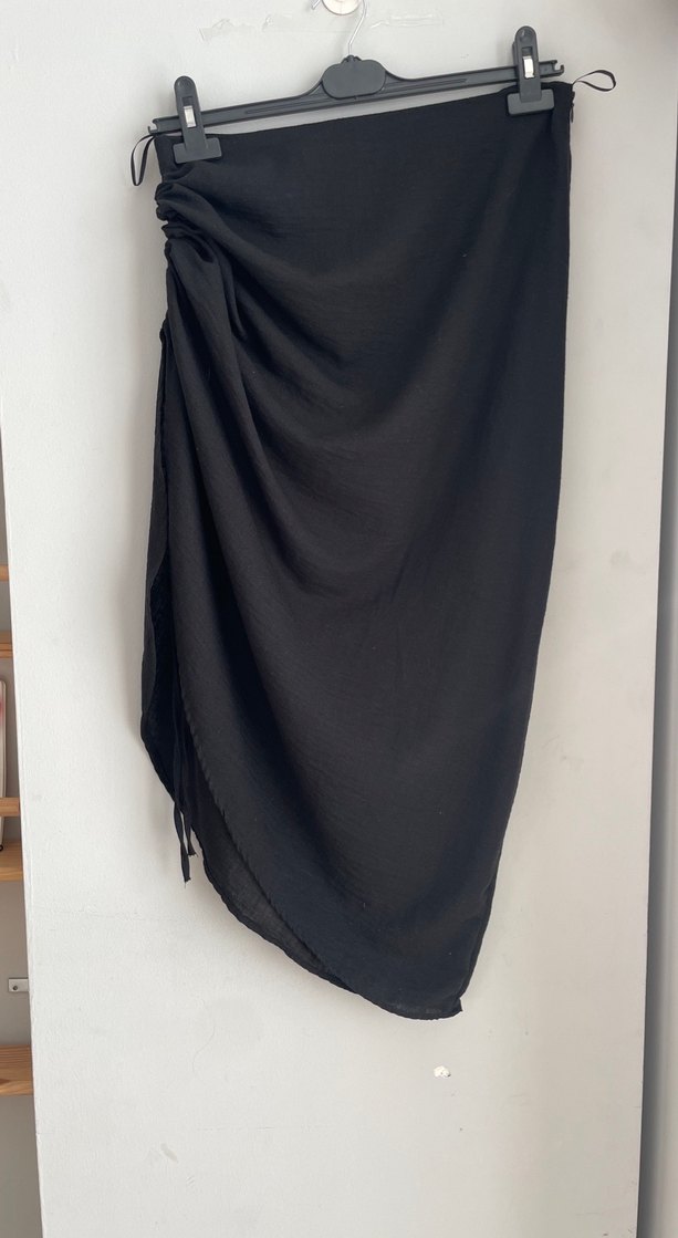 Siyah renkli, drapeli ve bol kesim uzun etek. Yırtmaç boyu ayarlanabilir.