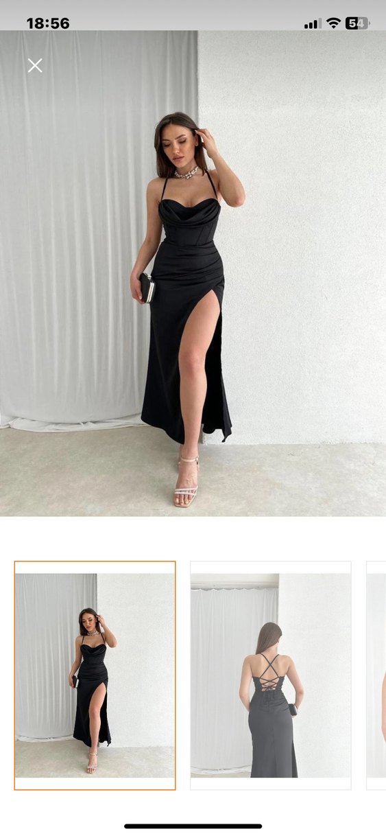 Siyah, askılı uzun elbise, straplez yakaya sahip, vücuda oturan kesim ve yüksek yırtmaç ile romantik akşamlar ve düğün için ideal.