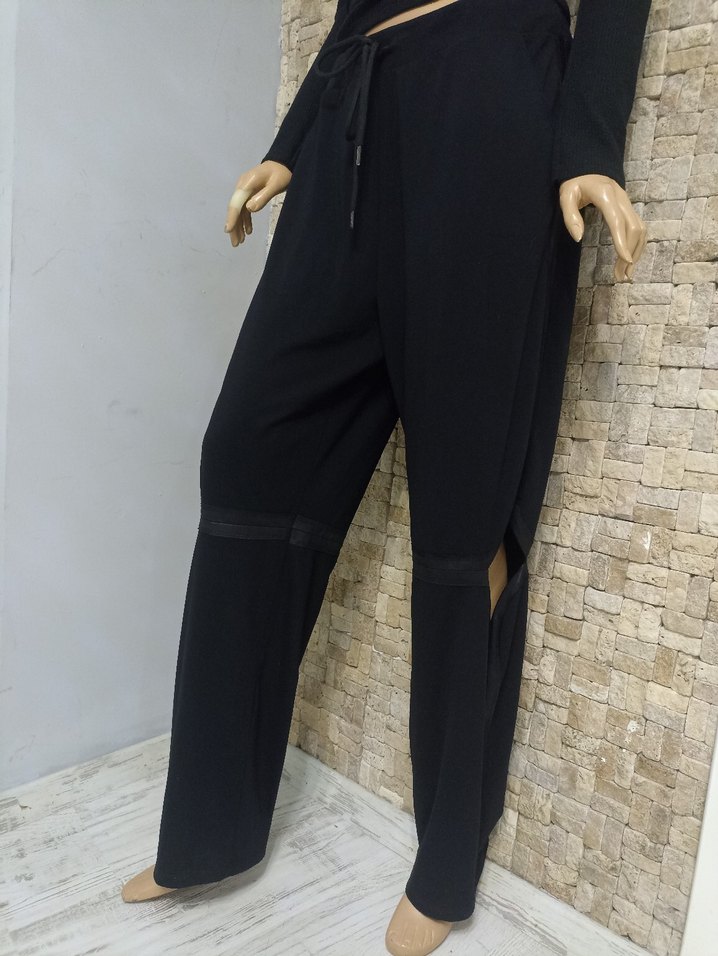 Siyah, bol kesim kadın kumaş pantolon, uzun boy ve yan yırtmaç detayına sahip, yumuşak sentetik kumaştan üretilmiştir. Beden XL uzunluk 112 cm