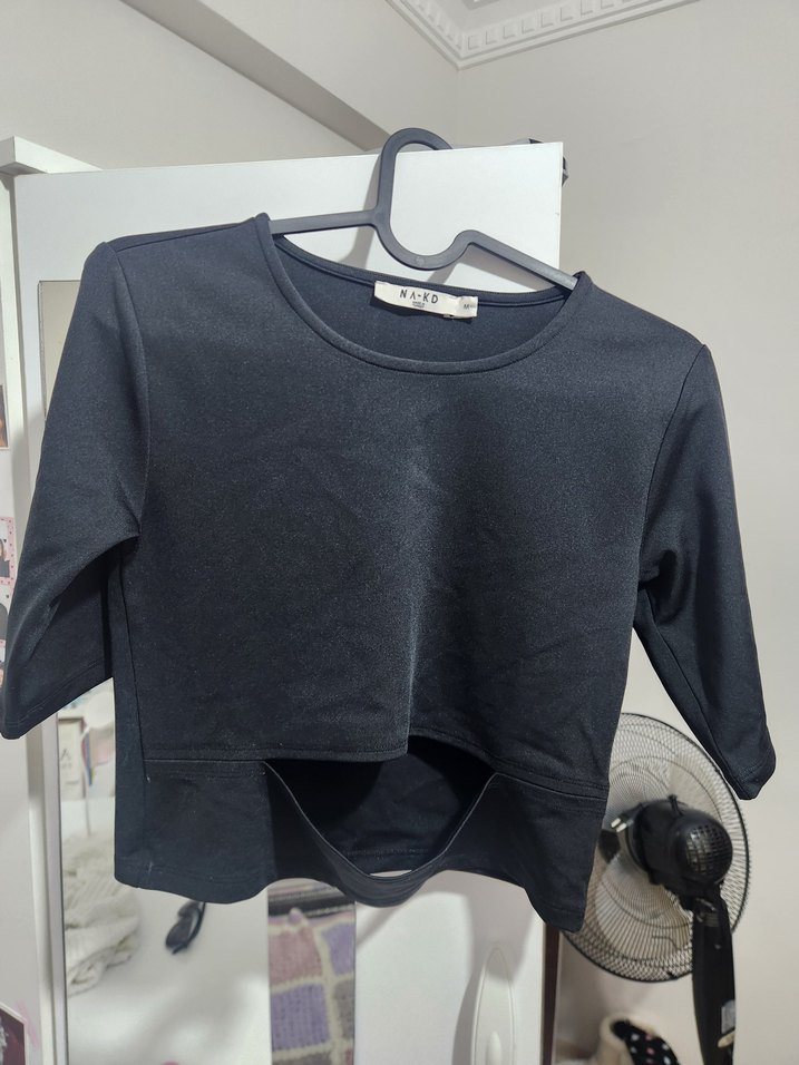 Siyah, uzun kollu, bisiklet yaka ve vücuda oturan crop top. Midi uzunluk ve şık kesim detayıyla gündelik kullanıma uygun, rahat ve trend bir parça.