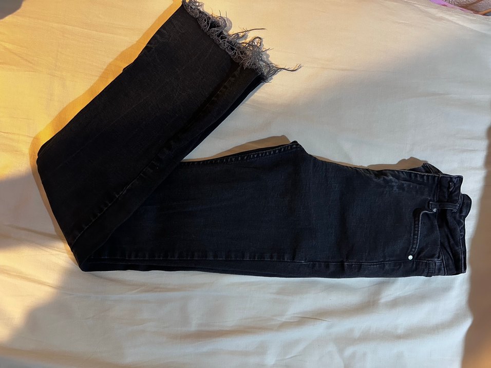 Siyah denim kot pantolon, normal boy ve regular fit. Paça kısmında yırtmaç detayı vardır. Günlük kullanıma uygun, sokak stiline uyumlu.