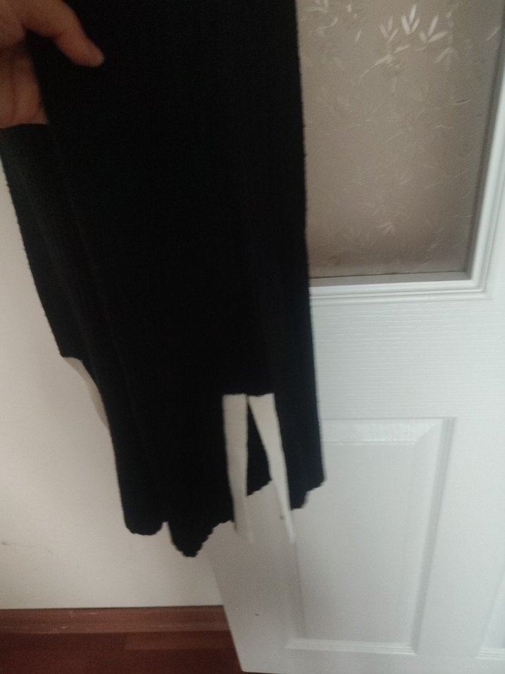 Siyah, yırtmaçlı, uzun ve vücuda oturan kumaş pantolon. Yumuşak ve sıcak dokulu malzemeden, gündelik kullanım için minimalist gotik tarzda.
