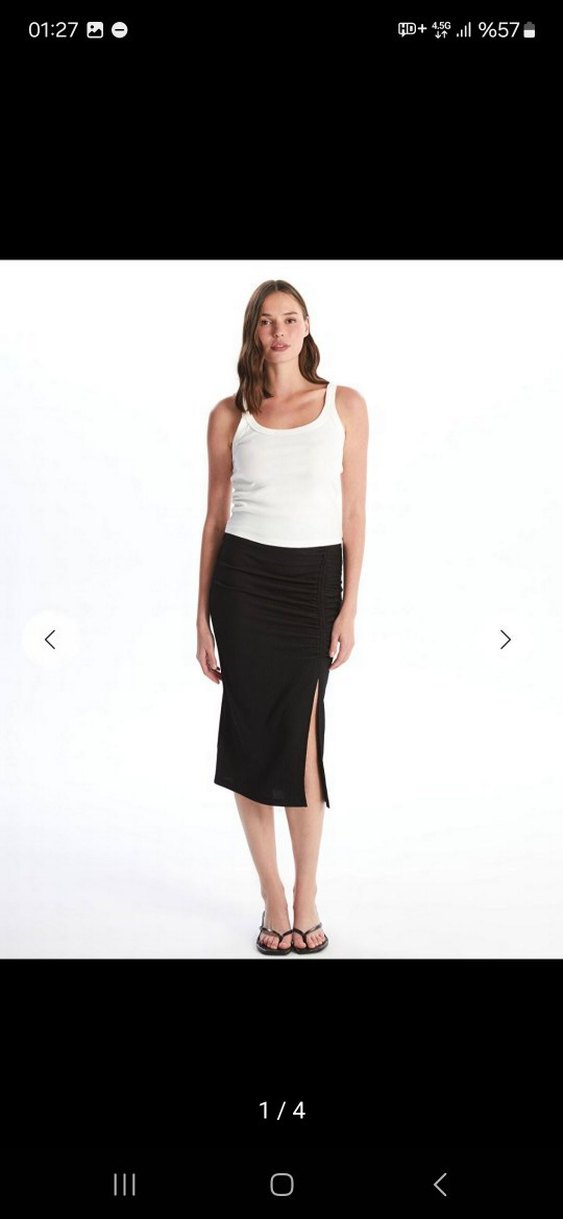 Siyah midi boy, ince kesim etek, yan yırtmaçlı ve ipeksi dokusuyla günlük kullanıma uygun, sade ve şık bir tasarımdır.