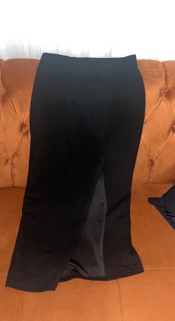 Siyah, ipeksi kumaştan ve vücuda oturan uzun etek, minimalist gotik tarzıyla ofis kullanımı için uygundur.