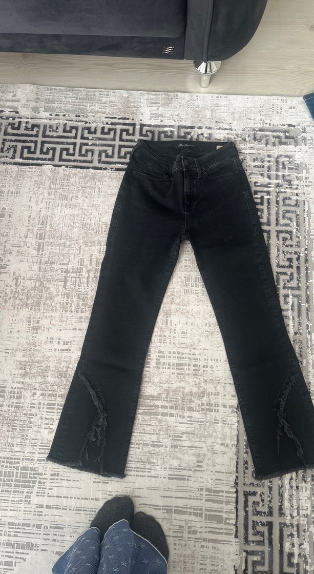 Siyah denim kot pantolon, regular fit ve midi boyda. Paçasında yırtmaç detayları ve hafif batik deseni ile sokak stiline uygun.