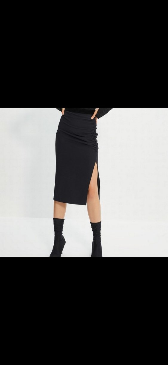 Siyah uzun dar etek, yan yırtmaçlı ve pürüzsüz sentetik kumaştan üretilmiştir. Günlük kullanımda zahmetsiz şıklık sunar.