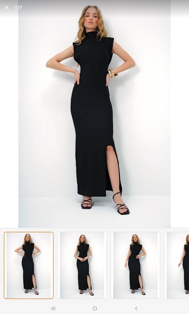 Yüksek yakalı, askılı kolları olan siyah uzun elbise. Düz, sentetik kumaştan ve rahat kesimlidir. Hiç giyilmemistir