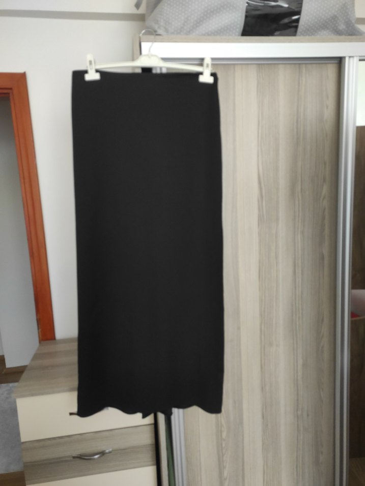 Siyah uzun, yırtmaçlı ve vücuda oturan kadın eteği. Pürüzsüz sentetik kumaştan üretilmiş, minimalist ve gotik tarz için uygun, ofis kullanımı için ideal.