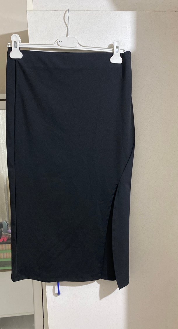 Düz siyah, yırtmaçlı uzun ve vücuda oturan sentetik kumaş kadın etek, ofis ve sokak stili için uygundur.