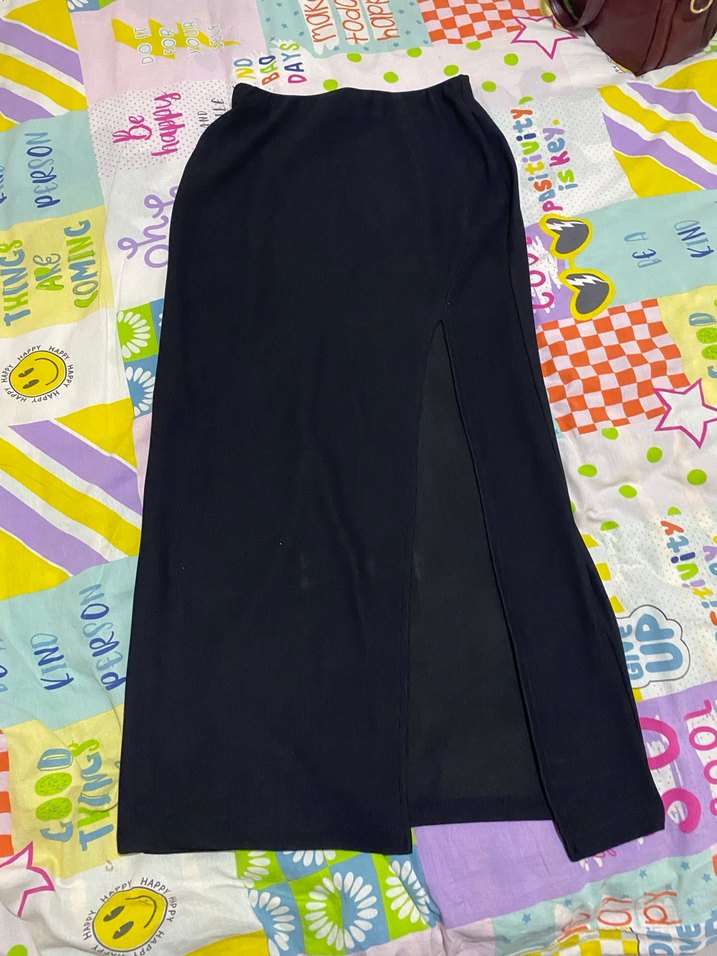 Sentetik kumaştan, yırtmaçlı ve bağlama desenli siyah uzun, dar kesim etek. Minimalist ve bohem tarzda günlük kullanım için uygundur. Sadece denendi.