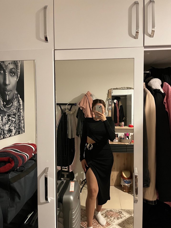 Siyah, yırtmaçlı, yüksek yakalı ve uzun kollu, vücuda oturan midi elbise. İnce ve parlak kumaştan yapılmış, minimal gotik tarzda cesur günlük kullanım için uygun.
