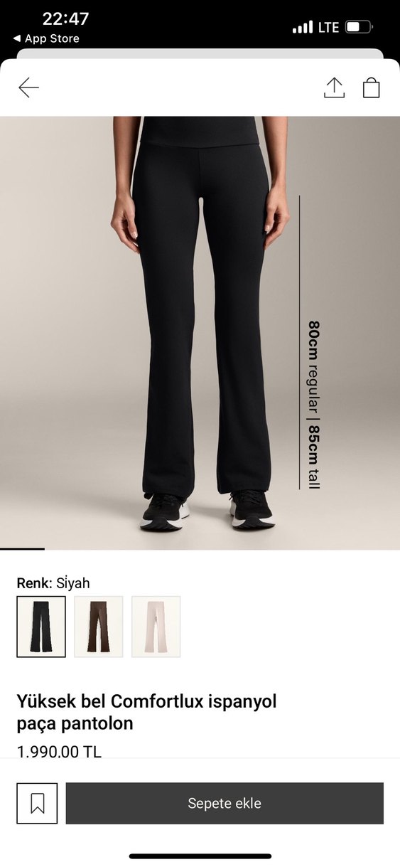 Siyah, yüksek bel Comfortlux ispanyol pantolon, normal boy ve regular kesim. Yumuşak sentetik kumaştan, spor ve günlük kullanıma uygun. Satma sebebim kilo almam ve bir kere giydim