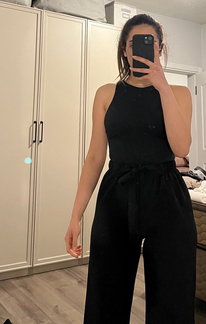 Siyah, yüksek belli, fit kesimi ve rahat şıklığıyla günlük kullanıma uygundur. Yumuşak sentetik kumaştan üretilmiştir.