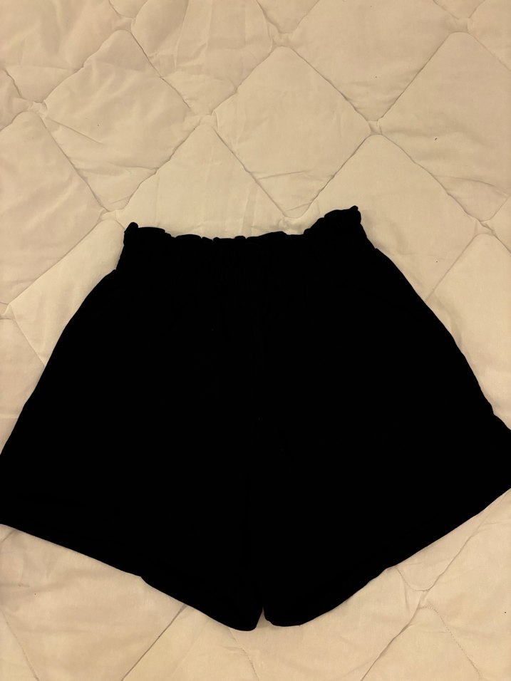Siyah yüksek bel mini şort, bol kesim ve ipeksi kumaşla rahat ve şık bir görünüm sunar.