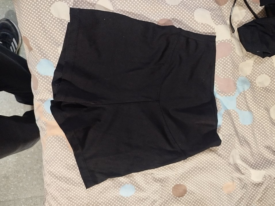 Siyah, yüksek bel, elastik bel bantlı mini spor şort. Düz ve sentetik kumaştan, spor ve goth tarzına uygun.