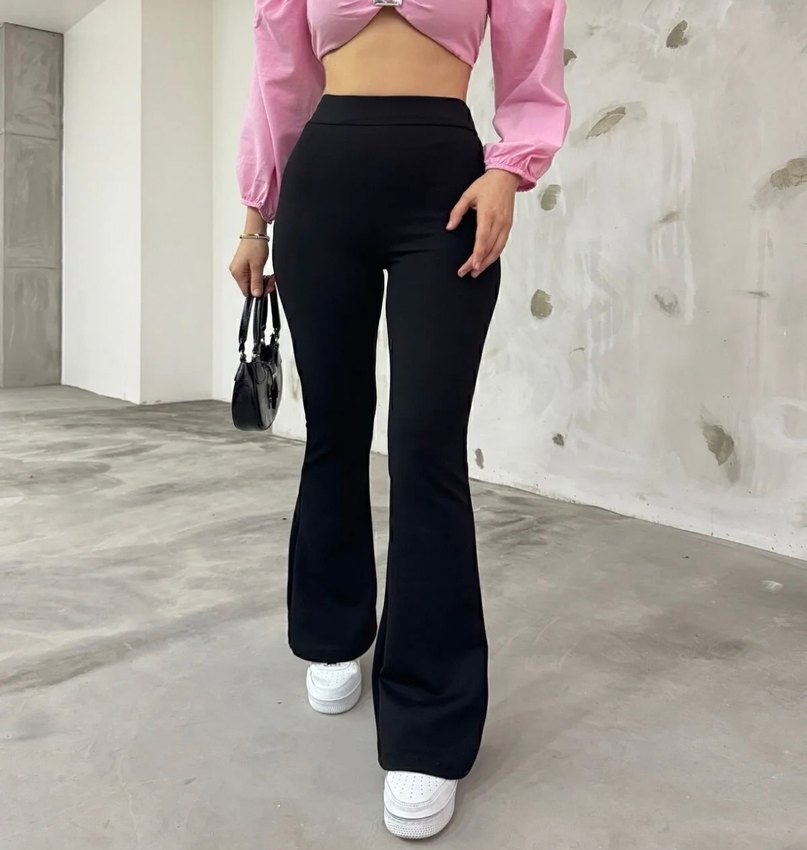 Yüksek bel, siyah kumaş pantolon, normal boyda ve dar kesimdir. Günlük athleisure tarzı için yumuşak sentetik kumaştan üretilmiştir.