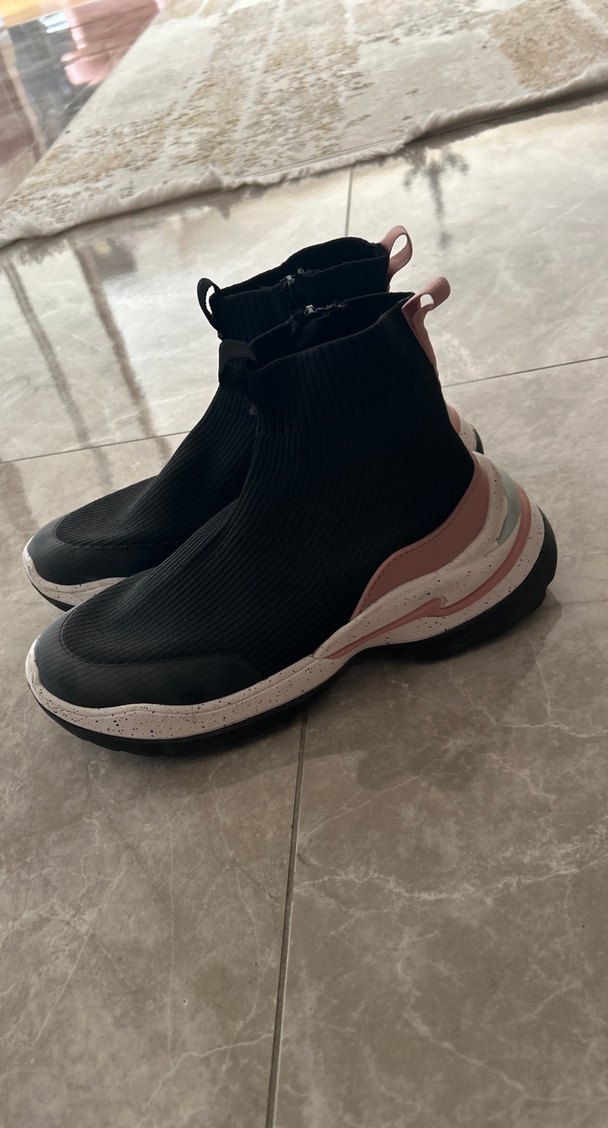 Siyah elastik üst yüzeyli, beyaz benekli tabanlı, yüksek tabanlı kadın spor ayakkabısı. Günlük rahat sokak stili için uygundur.