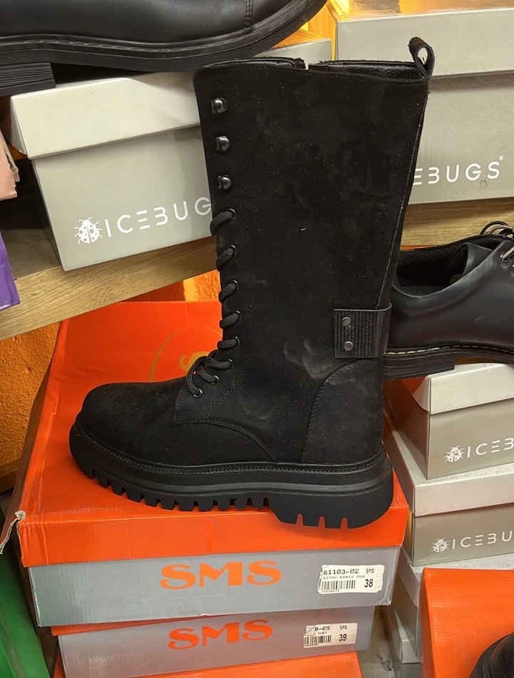 Siyah, süet malzemeden yapılmış yüksek topuklu ve bağcıklı kadın botu. Goth tarzı, sağlam tabanlı ve desensiz tasarımıyla günlük ve sokak stiline uygundur. hiç kullanılmadı etiketli ürün. 38-39 numara çeşitleir mevcuttur