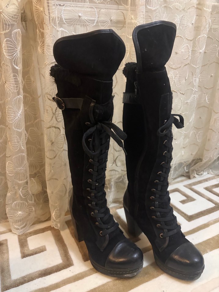 Siyah süet çizme, yüksek topuklu, önü bağcıklı ve tokalı. gotik tarzda, günlük kullanıma uygun. İçi çok sıcak tutan ince kürk kalıbı çok güzel