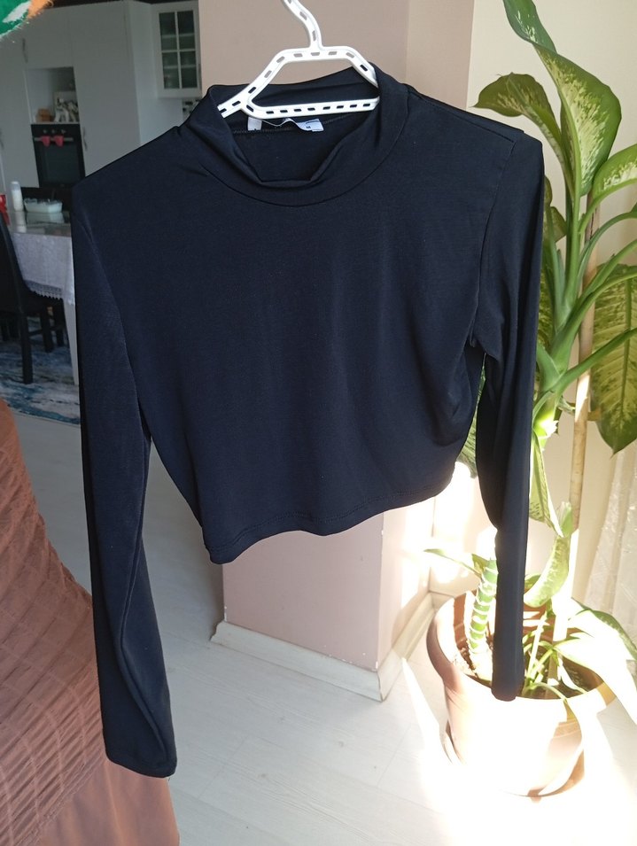 Siyah, yüksek yakalı, uzun kollu ve vücuda oturan ince günlük bluz kusursuz sm olur