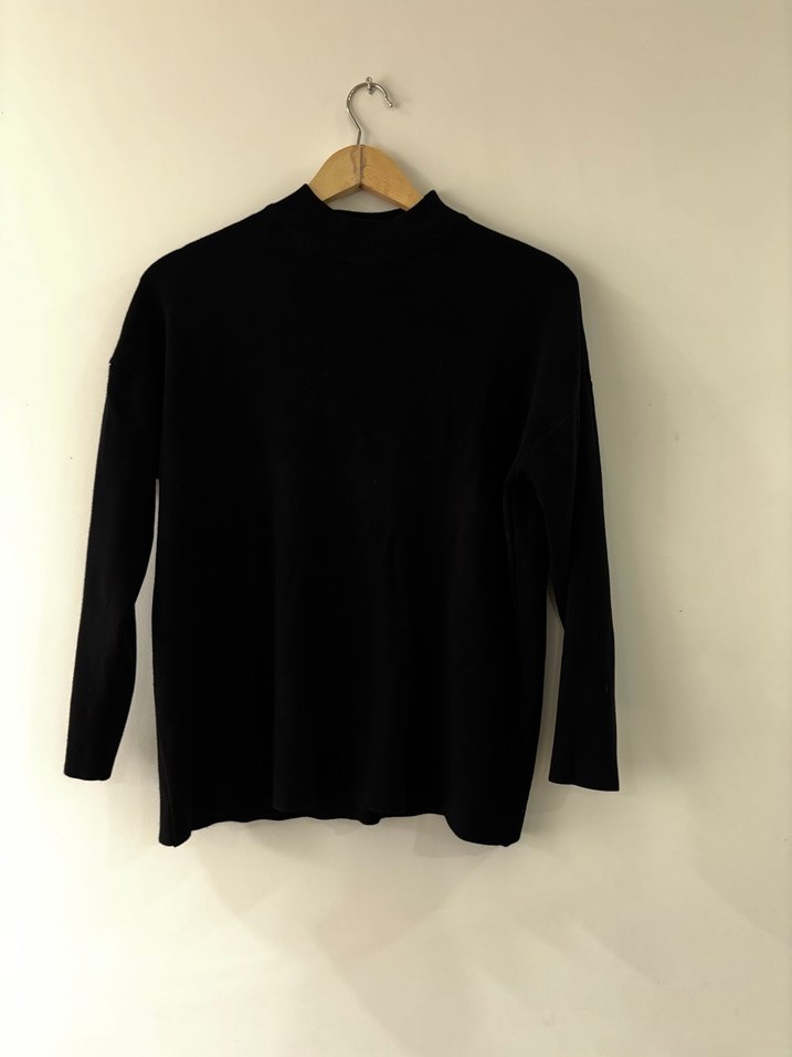 Siyah renkli, yüksek yakalı ve uzun kollu bu sweatshirt, bol kesimi ve yumuşak dokusuyla minimalist ve rahat bir stil sunar.