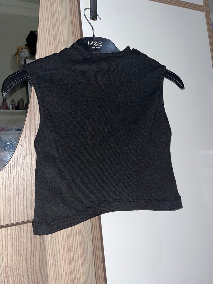 Siyah kolsuz crop top, yüksek yakalı ve vücuda oturan kesime sahip. Pürüzsüz sentetik kumaştan üretilmiş, gündelik dış mekan kullanımı için uygundur. Marka: M&S.