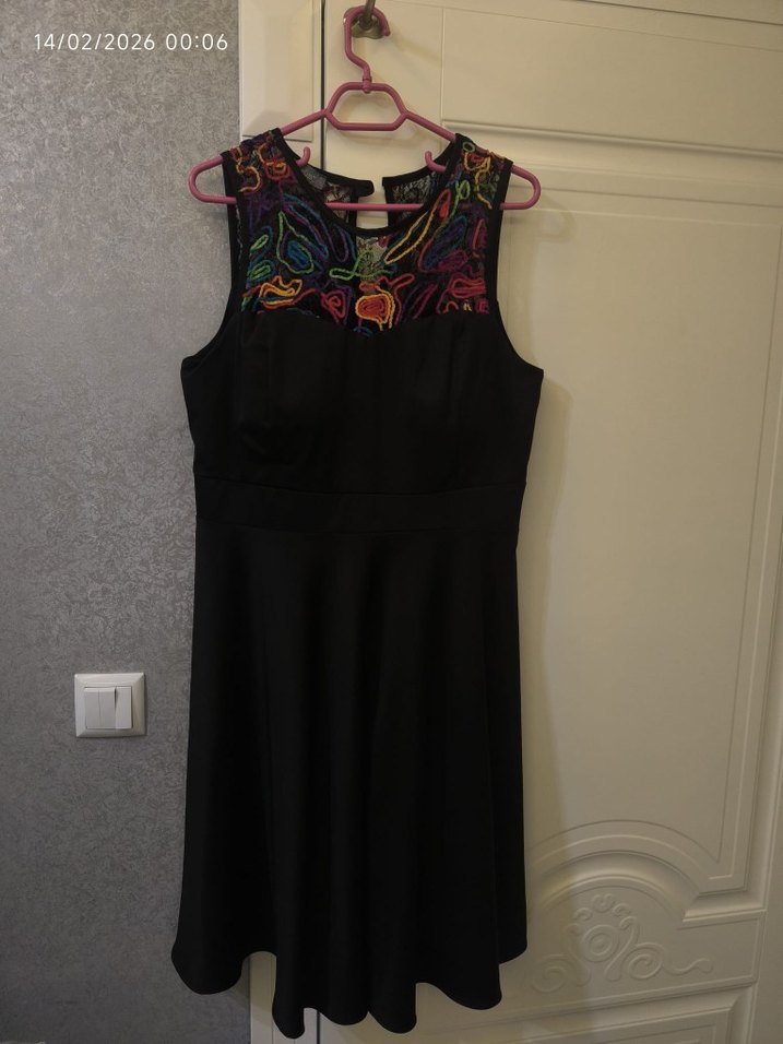 Siyah, kolsuz, yüksek yakalı midi elbise, renkli baskılı detaylar ve drapeli tasarımla parti için uygun, gotik ve bohem tarzda.