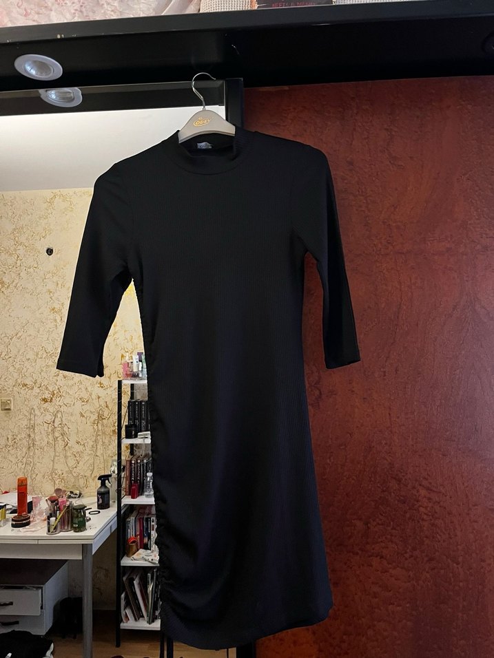 Bu siyah, yüksek yakalı yarın kollu ve vücuda oturan kesime sahiptir. Düz, minimalist tasarımı ve yumuşak sentetik kumaşı ile günlük kullanım için uygundur.