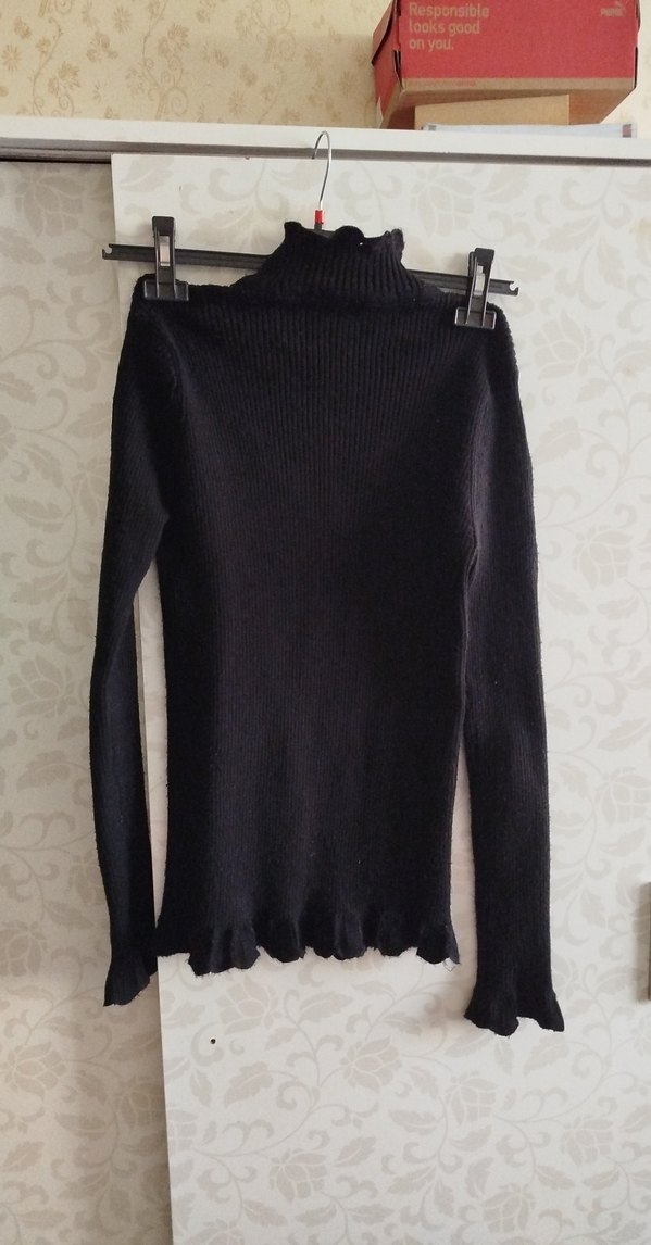 Bu siyah, yüksek yakalı ve uzun kollu triko kazak, rahat ve trend goth tarzını günlük kullanıma sunar. kolunda açıklık vardı onu diktim üretimden kaynaklı galiba sorun yok genel olarak defosu yok yırtık yok çok az giydim kolu hoşuma gitmiyor artık