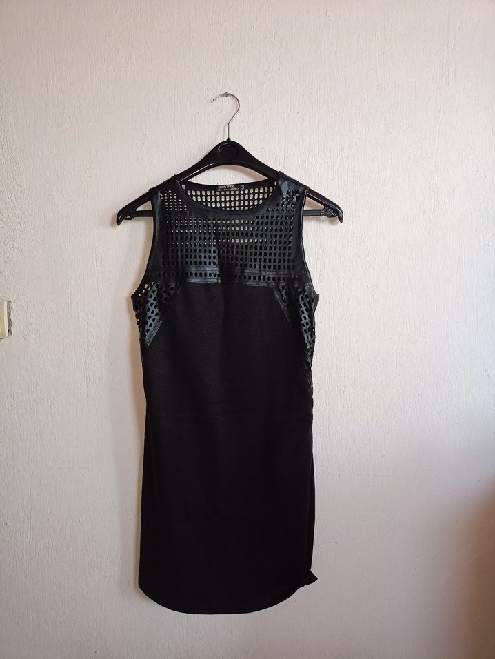 deri yakalı siyah ofis stil elbise önyaka etek uzunluğu 80 cm sırt etek uzunluğu 85 cm koltuk altı uzunluğu 40 cm deri olan kısım esnek değildir kumaş olan kısım esnektir