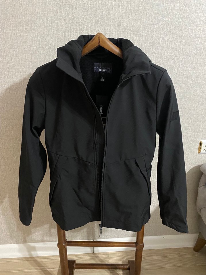 Yumuşak kumaştan yapılmış, yüksek yakalı ve fermuarlı, siyah erkek ceketi. İnce kesimi ve uzun kollarıyla günlük sokak stili için uygundur.