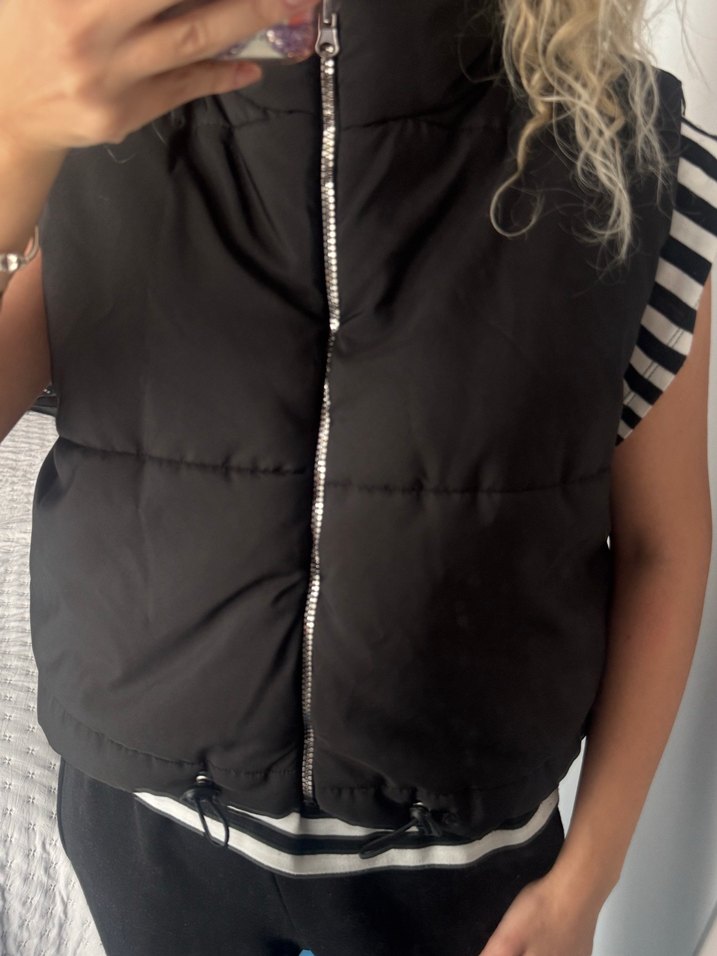 Fermuarlı, yüksek yakalı, siyah renkli, düz desenli, sentetik kumaştan, normal boy midi kesim, fitted kadın yelek. Ürün butik ürünüdür beyaza yakın kırık beyaz siyah karışımı fermuar parlak günlük hayatta ve spor kolay kombinlenenecek bir parça görüldüğü gibidir