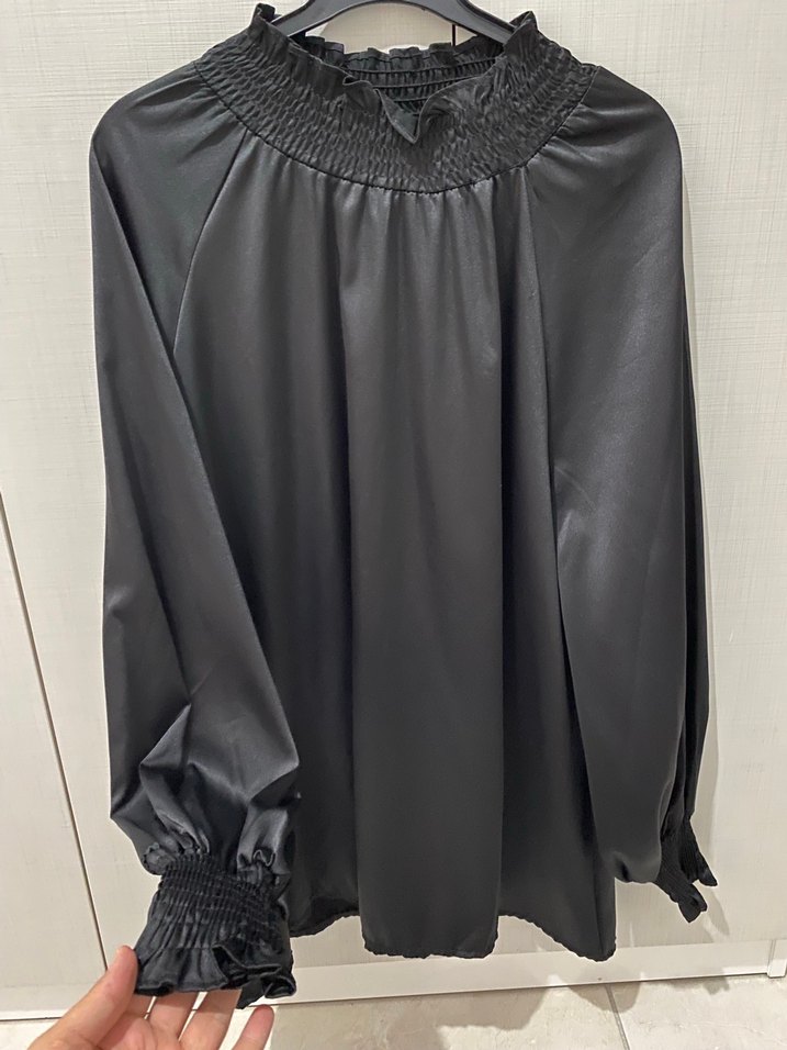 Siyah, yüksek yakalı ve uzun kollu, drapeli geniş kesim kadın bluz. Ofis kullanımı için uygun, ipeksi dokuda. Touche marka 38 beden az kullanıldı