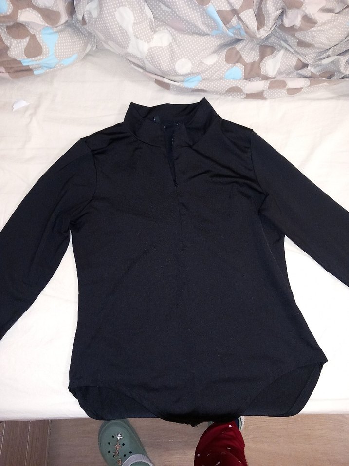 Siyah hamile gömleği, yüksek yakalı ve uzun kolludur. Vücuda oturan kesimi ve normal boyuyla ofis için uygun, şık ve goth esintili athleisure tarzındadır.