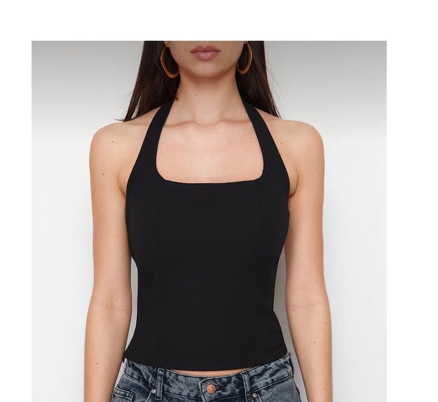 Siyah Yüksek Yakalı İnce Askılı Kadın Bluz