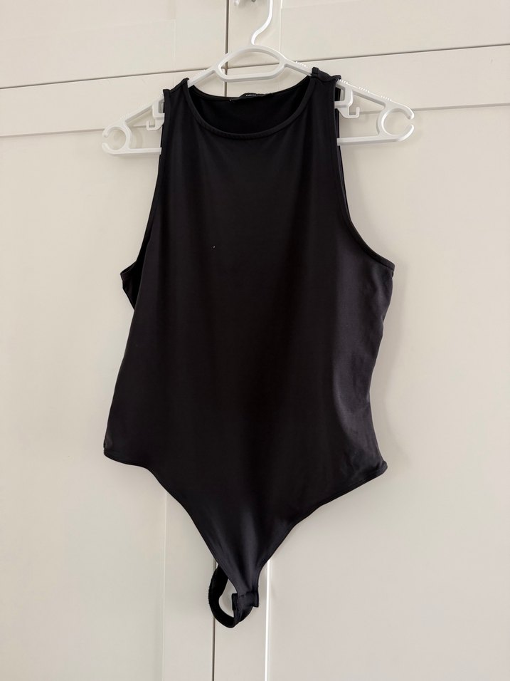 Siyah renkli, yüksek yakalı, kolsuz ve ince fit kesime sahip bir emzirme atlet bodysuit. Normal midi uzunluğunda ve desensizdir.