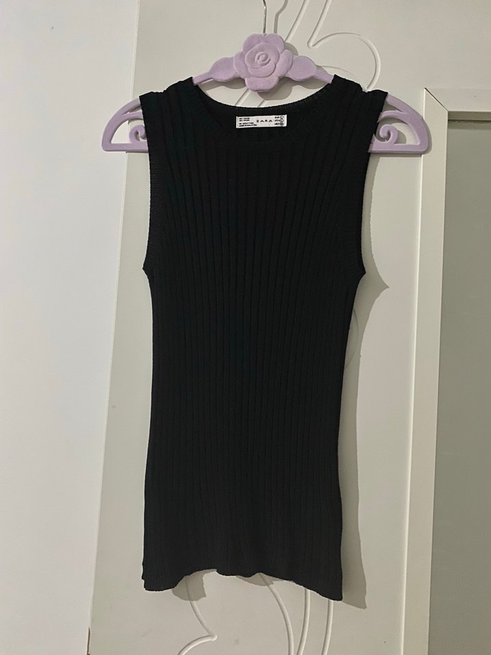 Yüksek yakalı, kolsuz ve midi uzunlukta siyah, ince örgü kadın süveter. Minimalist goth tarzında, günlük kullanıma uygun.