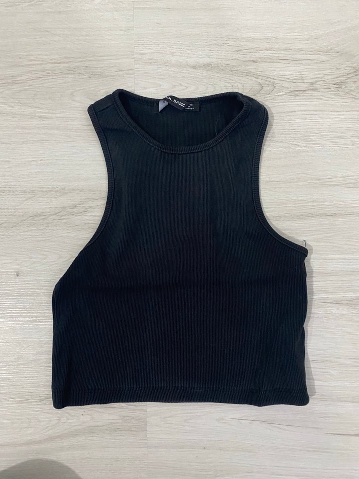 Siyah, yüksek yakalı ve kolsuz kadın atlet, düz ve vücuda oturan kesime sahiptir. Günlük kullanım için uygun, yumuşak sentetik kumaştan üretilmiştir.
