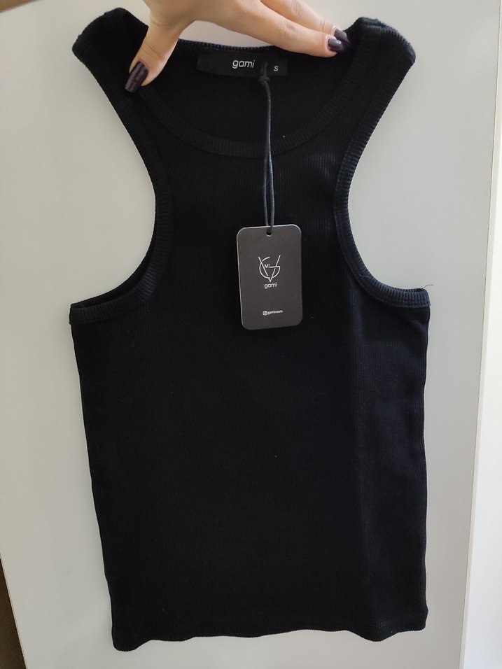Yüksek yakalı, kolsuz ve baskılı desene sahip siyah kadın atlet. Düzgün sentetik kumaştan, goth ve athleisure tarzında, trend günlük kullanım için uygundur. kol kısmı derin olan modelden hiç kullanılmadı