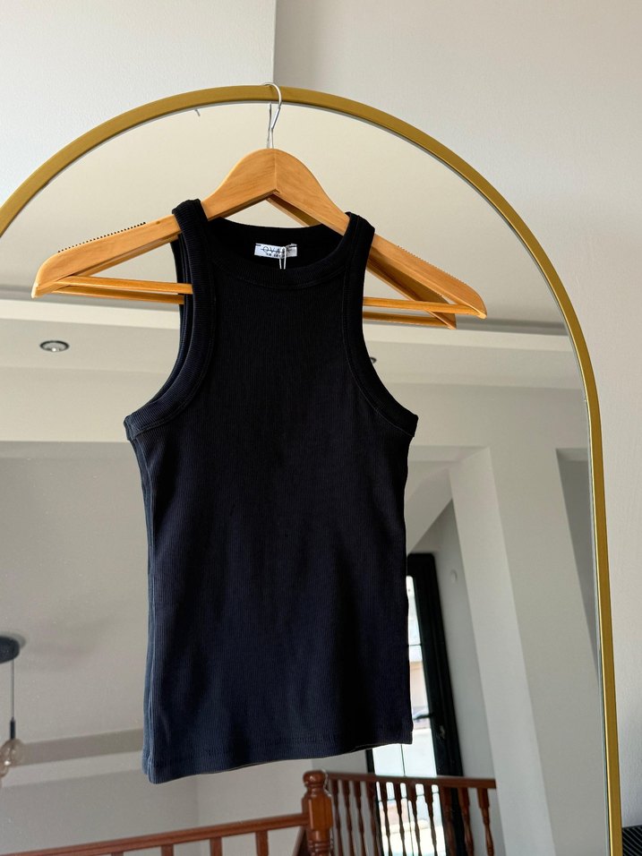 Yumuşak pamuktan üretilmiş, siyah renkte, yüksek yakalı ve dar kesim kadın atlet. Minimalist ve sokak stiliyle günlük kullanıma uygundur.
