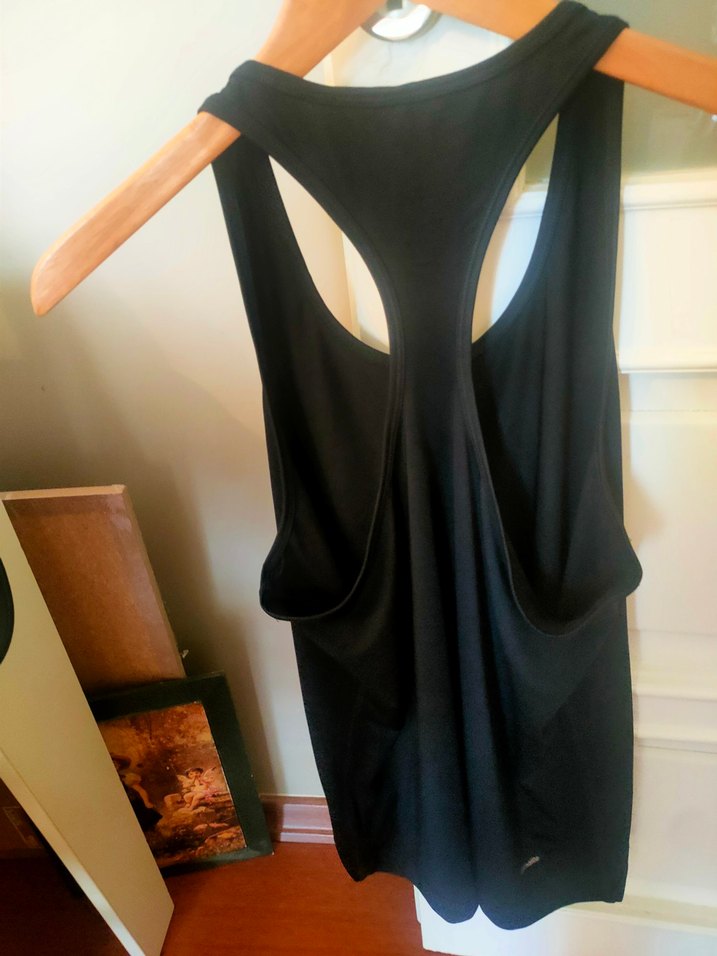 Siyah, yüksek yakalı, kolsuz kadın atlet. Vücuda oturan kesimi ve midi boy uzunluğuyla sade ve şık bir görünüm sunar.