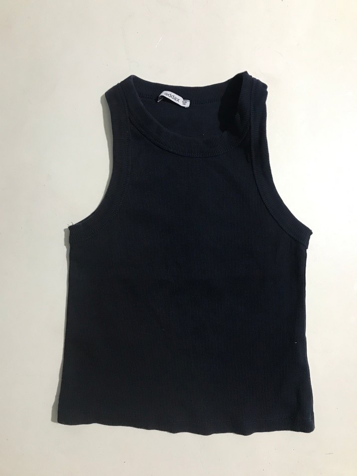 Düz siyah, yüksek yakalı, kolsuz ve vücuda oturan kadın atlet. Pürüzsüz sentetik kumaştan üretilmiş, günlük kullanıma uygun sade ve şık bir model.