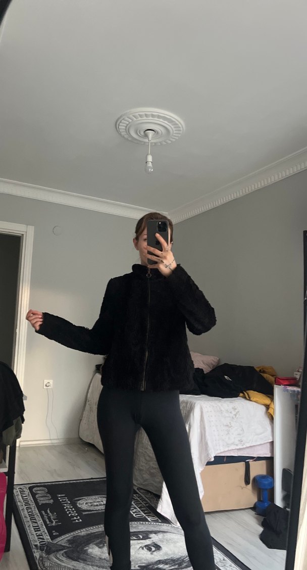 Yüksek yakalı, uzun kollu, siyah kadın ceketi, yumuşak ve sıcak kumaştan, günlük kullanım için uygun.