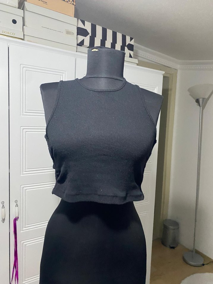 Siyah, yüksek yakalı ve kolsuz, vücuda oturan crop top. Pürüzsüz pamuklu kumaştan, minimalist ve cesur sokak stili için uygundur.