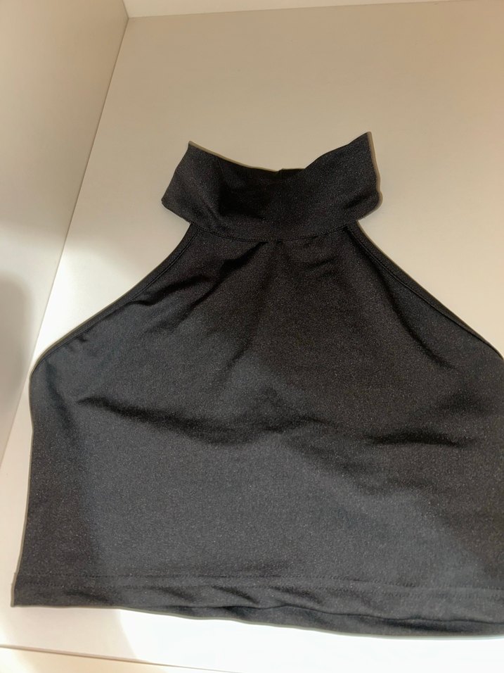 Siyah sentetik kumaştan, yüksek yakalı ve kolsuz, vücuda oturan kadın crop top eldivenleri mevcut