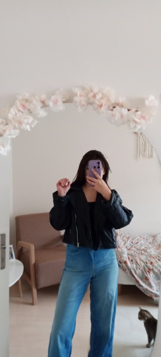 Siyah, yüksek yakalı, uzun kollu ve fitted kesim kadın deri ceket. Denim malzemeden üretilmiş, rahat ve şık günlük kullanım için uygun. kızlar gerçekten çok havalı ütüsünü göndermeden önce yaptıracağım beden olsak S M olur