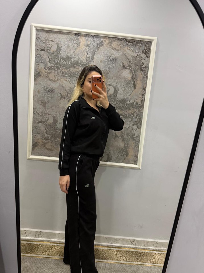 Yüksek yakalı ve uzun kollu, rahat kalıplı kadın eşofman takımı. Yumuşak ve sıcak kumaştan, siyah renkte, yan çizgilerle sade ve şık görünüme sahip.